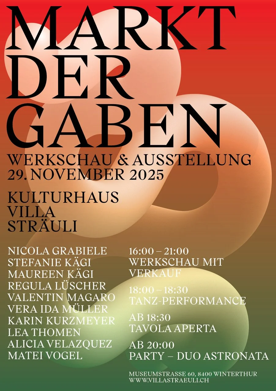 On the first weekend of Advent, Villa Sträuli presents a new format: the Markt der Gaben, or Market of Gifts – an event that draws on the tradition of annual gifts in art associations and brings it into the present day. The focus is on the gift – understood as artistic expression, as a contribution to the community. Discover new works fresh from the studio, learn their stories, and engage in conversation with the artists. Find your perfect match and take it home with you!